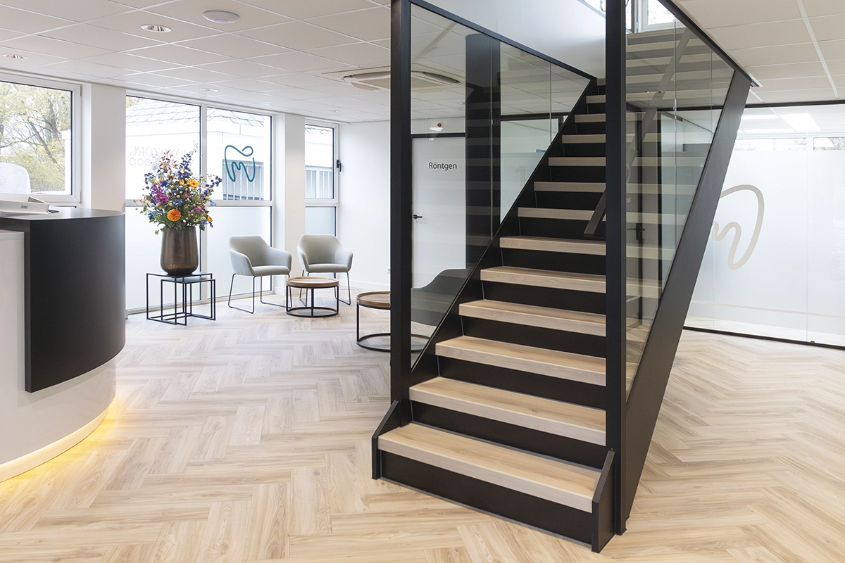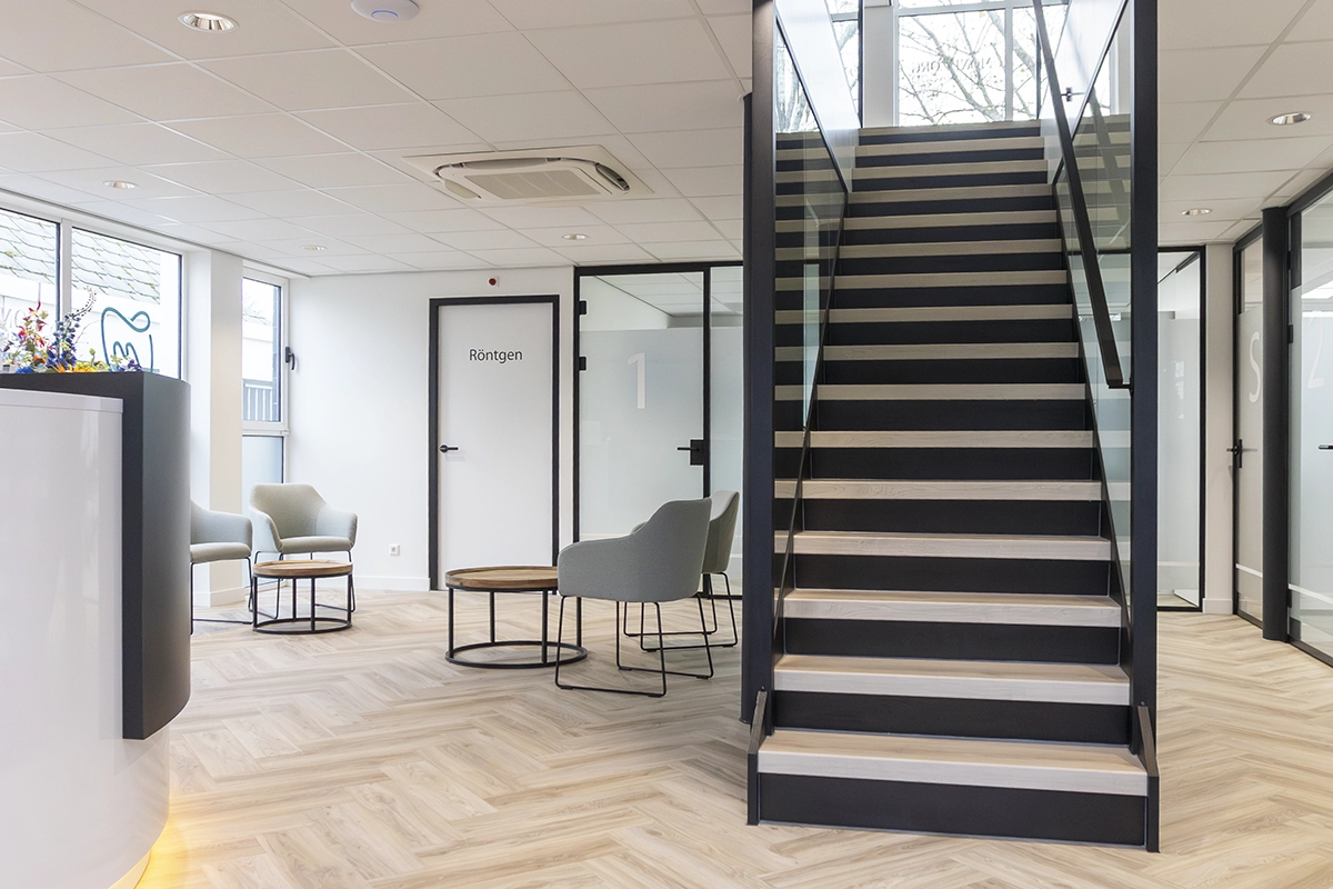 De vriendelijke ontvangst- en wachtruimte met de in het oog springende trapopgang zijn de eye-catchers bij binnenkomst. Op de begane grond zijn naast de