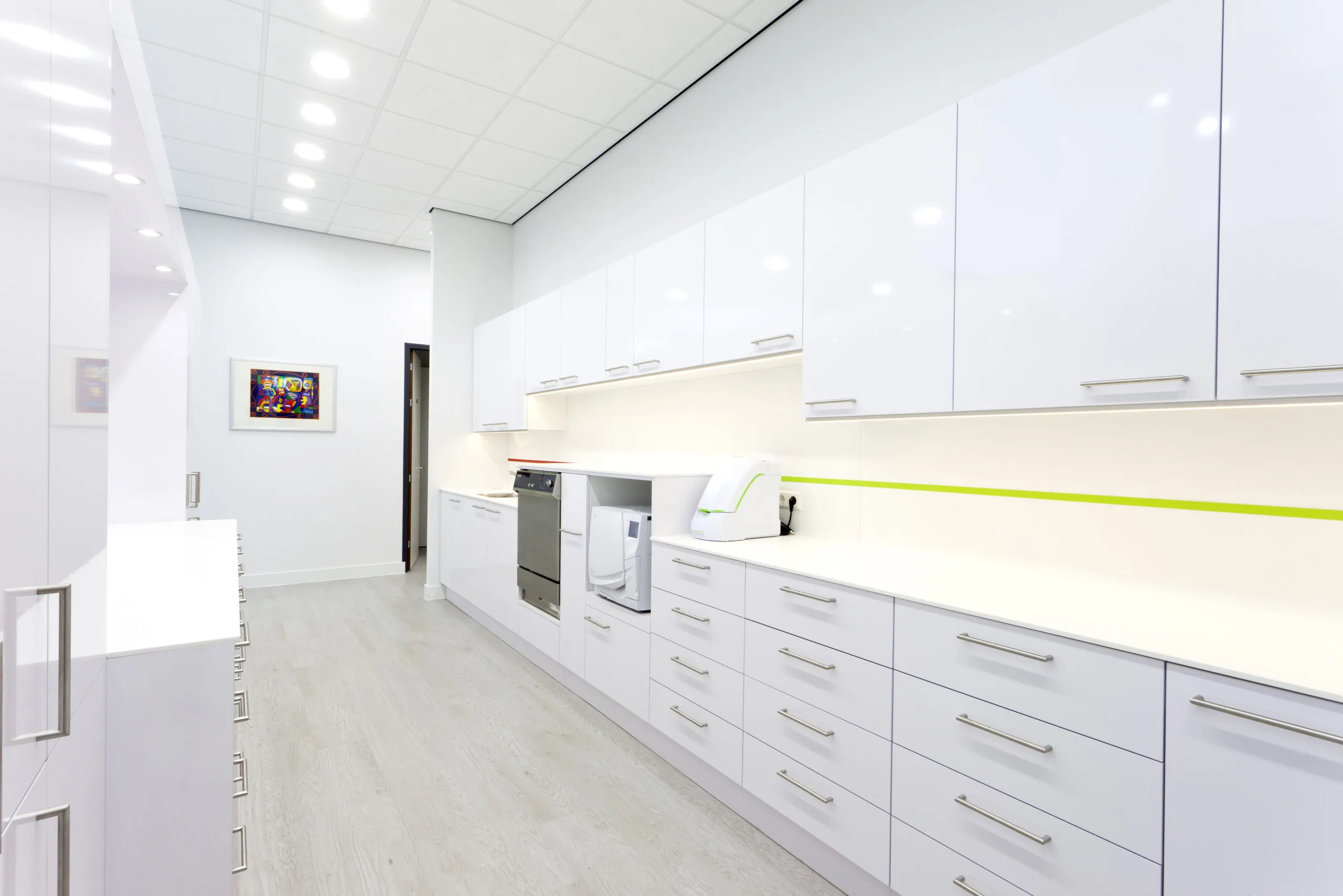 Uitgangspunten voor de nieuwe praktijk waren; veel licht in de ruimtes, juiste ergonomie, aandacht voor privacy en maximaal gebruik van de hoogte van het pand. E Build nam dit Turn-Key project van ontwerp tot realisatie en inrichting op zich. De casco ruimte van bijna 400 M2 werd in korte tijd veranderd in een moderne orthodontiepraktijk.